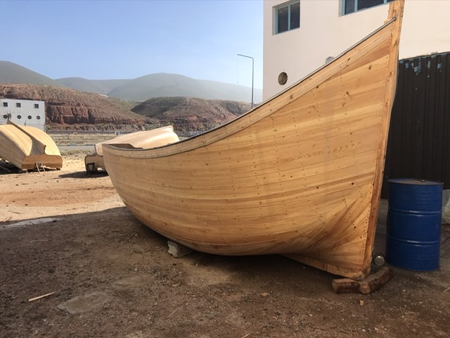 Port Sidi Ifni was a few miles from the town by road – or a good walk along the beach. On this occasion we took the road route on the motor bike. We had heard tell of a new restaurant at the port and we were always keen to discover new eateries. There was a Customs post at the port entrance where we were asked to show our passports and warned not to take photographs. There was no sign of a restaurant or café, in fact there wasn’t anything of great interest except for a hundred or so small fishing boats and a couple of larger ones, nothing at all politically sensitive. We peeped into a small workshop to watch a pair of Spanish craftsmen building a traditional boat out strips of green wood. They told us it took them a month to build before it was finally sheathed in fibre glass.