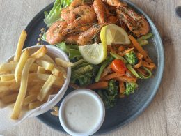 The next morning it was warm, the sky was mostly blue and our grumpiness dissipated as we enjoyed driving south in the warm sunshine. We stopped for a couple of days at Kènitra, a town on the Atlantic coast just north of Rabat. We had lunch in one of the many seaside restaurants. Bread, salads and an enormous plate of grilled prawns (I had grilled squid) cost £25 for the two of us – no booze.