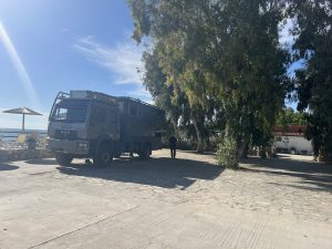 We stayed at a small camp site at the seaside town of Nea Karvali on the north Aegean coast. The site was small and, out of season, it was cluttered with ancient caravans, hunched under sagging canvas covers, surrounded by the detritus of camping life – tables, chairs, barbecues. It didn’t look as if there would be space for our big truck.