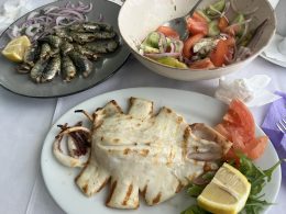 We received a warm welcome from the owner, Maria, who found us a perfect place to park overlooking the beach and next to the restaurant. At that time of year the family-run restaurant was open all day until 5 pm, serving traditional Greek dishes as well as fresh fish and seafood.
