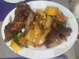 Ochi was a day of celebration, church bells rang and Maria’s family closed their restaurant for the day and were having a private party. Maria told us she was serving her guests a traditional dish of oven baked lamb. We must have looked pathetic, like a pair of big-eyed starving puppies because at midday she came over with a huge plate of lamb and potatoes. The meat was delicious, soft and sweet with an aroma of herbs, garnished with fresh lemon.