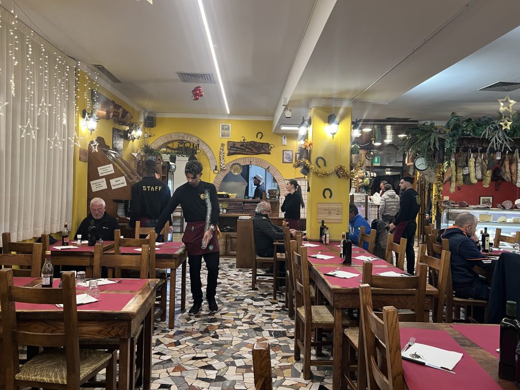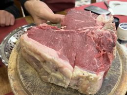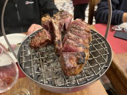 As we were shown to our (shared) table, jugs of red wine and baskets of bread were distributed, the cacophony around us made it impossible to hear each other speak.  We didn’t have to wait long  before a waiter showed us an enormous uncooked T-bone steak.  They told us what it weighed and the cost before it was taken to be cooked (rare) on an oak wood fire.